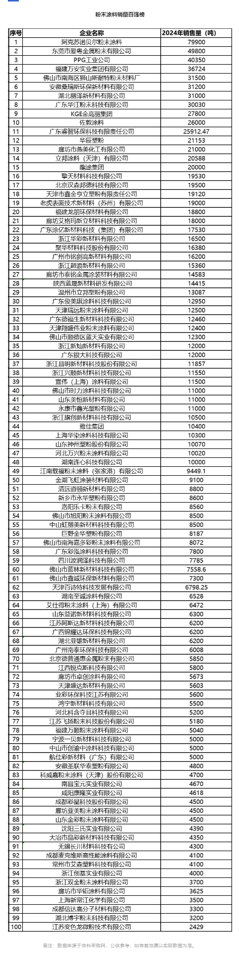 榜單顯示,作為國內(nèi)最大的粉末涂料企業(yè),阿克蘇諾貝爾粉末涂料79900噸位居榜首,這已是阿克蘇諾貝爾連續(xù)9年蟬聯(lián)中國粉末涂料銷量100強(qiáng)之首,同比增長7%,其增速較2023年增速提升了2.5個百分點,足以證明阿克蘇諾貝爾在中國粉末涂料行業(yè)具有很強(qiáng)的市場競爭力。其次是東莞市愛粵金屬粉末有限公司以49800噸位居第二,同比增長2%;排名第三則是PPG工業(yè)公司40350噸,同比增長1%。和2023年中國粉末涂料百強(qiáng)排行榜相比,前三名的粉末涂料企業(yè)并沒有發(fā)生變化。