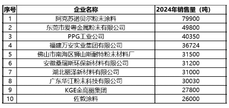 從粉末涂料銷量100強(qiáng)增長速度來看,2024年在國內(nèi)市場嚴(yán)重內(nèi)卷的大背景之下,60多家粉末涂料企業(yè)的銷量出現(xiàn)不同程度的增長。從2024年粉末涂料銷量百強(qiáng)排行榜來看,銷量前10強(qiáng)企業(yè)總銷量同比2023年增長5.3%。