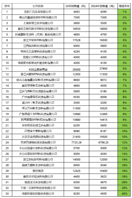 福建萬安、斯耐特、安徽桑瑞斯、麗澤新材料、華江粉末、KGE金高麗集團(tuán)、佐敦銷量分別為36724噸,31500噸、31200噸、31000噸、30030噸、27800噸、26000噸,分別排名在榜單第4~10位,其中除了KEG金高麗集團(tuán)2024年銷量同比下滑5%之外,其它9家企業(yè)的銷量都有所增長。從排名變化上來看,相較于2023年粉末涂料銷量100強(qiáng),佐敦涂料排名從第17位躍入前十強(qiáng),其銷量同比增長44%。