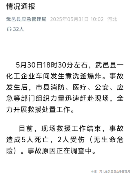 5月31日,河北省武邑縣應(yīng)急管理局發(fā)布通報(bào):5月30日18時(shí)30分左右,武邑縣一化工企業(yè)車間發(fā)生煮洗釜爆炸。事故發(fā)生后,市縣消防、醫(yī)療、公安、應(yīng)急等部門組織力量趕赴現(xiàn)場(chǎng),全力開展救援處置工作。