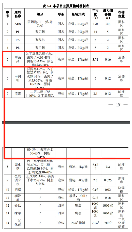 本項目噴漆工序使用中涂漆、中閃銀、清漆、固化劑、稀釋劑, 配比比例分別為中涂漆:固化劑:稀釋劑=100:16:16;中閃銀:固 化劑:全效調(diào)合水=60:40:30;清漆:固化劑=2:1.根據(jù)企業(yè)提供的 VOCs 檢測報告(見附件 14.VOCs 檢測報告按照《低揮發(fā)性有機 化合物含量涂料產(chǎn)品技術(shù)要求》(GB/T 38597-2020)要求測試方法 進行檢測,檢測結(jié)果不考慮水的稀釋比例)。