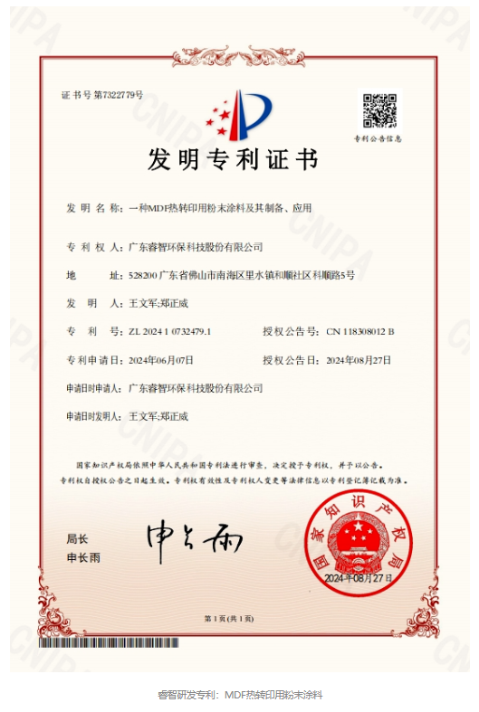 睿智憑借十余年環(huán)保粉末涂料領(lǐng)域的深厚積淀,針對MDF表面防護的技術(shù)瓶頸,帶領(lǐng)研發(fā)團隊攻堅克難,成功研發(fā)出一款MDF熱轉(zhuǎn)印粉末涂料。
