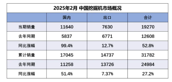 陽春三月,工程機(jī)械行業(yè)的熱度堪比歷年的“金九銀十”。2025年2月,銷售各類挖掘機(jī)19270臺(tái),同增52.8%。其中國內(nèi)銷量11640臺(tái),同增99.4%;出口量7630臺(tái),同增12.7%。