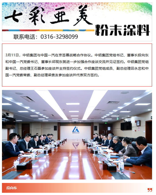 對邱現(xiàn)東一行的到訪表示歡迎,并回顧了中鋁集團與中國一汽交流合作情況。他表示,中鋁集團與中國一汽同為國資央企,共同肩負(fù)服務(wù)國家戰(zhàn)略、引領(lǐng)行業(yè)創(chuàng)新和綠色發(fā)展、促進經(jīng)濟社會發(fā)展的責(zé)任使命,近年來,雙方在多個領(lǐng)域開展了富有成效的合作。此次戰(zhàn)略合作協(xié)議的簽署,是中鋁集團與中國一汽合作歷程中的重要里程碑。