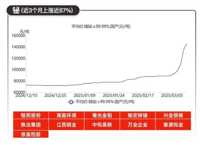 目前國(guó)內(nèi)精鉍價(jià)格已創(chuàng)2015年以來近10年新高,海外國(guó)際市場(chǎng)鉍價(jià)格從每磅6美元激增至35美元(每噸漲超50萬(wàn)元)。原材料粗鉍市場(chǎng)供不應(yīng)求,精鉍生產(chǎn)企業(yè)產(chǎn)能偏緊,加上持貨者惜售等情緒的聯(lián)合作用下,金屬鉍價(jià)格迎來了最瘋狂的漲勢(shì):暴漲4天后,從8萬(wàn)元/噸暴漲至16萬(wàn)元/噸,實(shí)際成交價(jià)甚至高達(dá)17萬(wàn)-18萬(wàn)元,生產(chǎn)商全員停售。