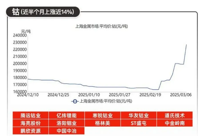 小金屬鈷國(guó)內(nèi)報(bào)價(jià)飆升至3.67萬(wàn)元/噸,10日之內(nèi)上漲超過37%,最高漲幅接近50%。原因是剛果民主共和國(guó)(剛果(金))于2月宣布的為期四個(gè)月的出口禁令,疊加當(dāng)?shù)卣蝿?dòng)蕩的傳聞,市場(chǎng)恐慌迅速發(fā)酵。出口禁令讓市場(chǎng)提前進(jìn)入“預(yù)期定價(jià)”模式,從剛果(金)到中國(guó)的運(yùn)輸周期長(zhǎng)達(dá)70至80天,真正的供應(yīng)缺口可能要到夏季才顯現(xiàn)。