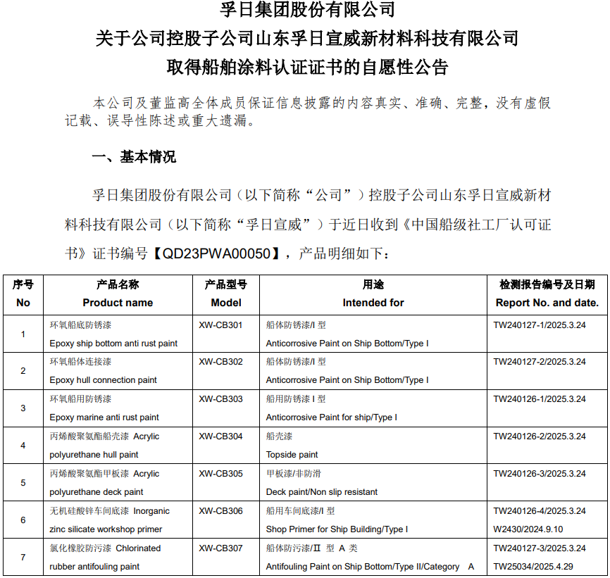在工業(yè)防腐涂料領域,船舶涂料因其技術難度高、附加值大,一直被視為“皇冠上的明珠”。2025年6月10日晚,孚日股份發(fā)布公告稱,公司控股子公司孚日宣威成功取得《中國船級社工廠認可證書》。這一成果不僅標志著孚日股份正式進軍船舶涂料市場,也為其在功能性涂層材料領域的多元化發(fā)展注入了強勁動力。