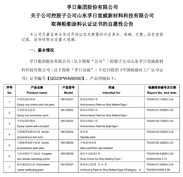 在工業(yè)防腐涂料領(lǐng)域,船舶涂料因其技術(shù)難度高、附加值大,一直被視為“皇冠上的明珠”。2025年6月10日晚,孚日股份發(fā)布公告稱,公司控股子公司孚日宣威成功取得《中國船級社工廠認(rèn)可證書》。這一成果不僅標(biāo)志著孚日股份正式進(jìn)軍船舶涂料市場,也為其在功能性涂層材料領(lǐng)域的多元化發(fā)展注入了強(qiáng)勁動力。