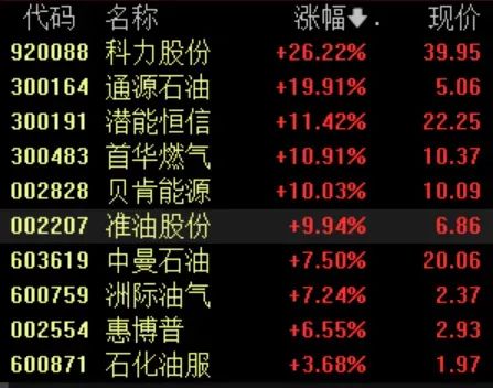 同時也拉動油氣股本周一開盤大漲,通源石油20%漲停,貝肯能源、準油股份漲停,中曼石油、潛能恒信、新錦動力、惠博普、仁智股份、中海油服等多股跟漲。