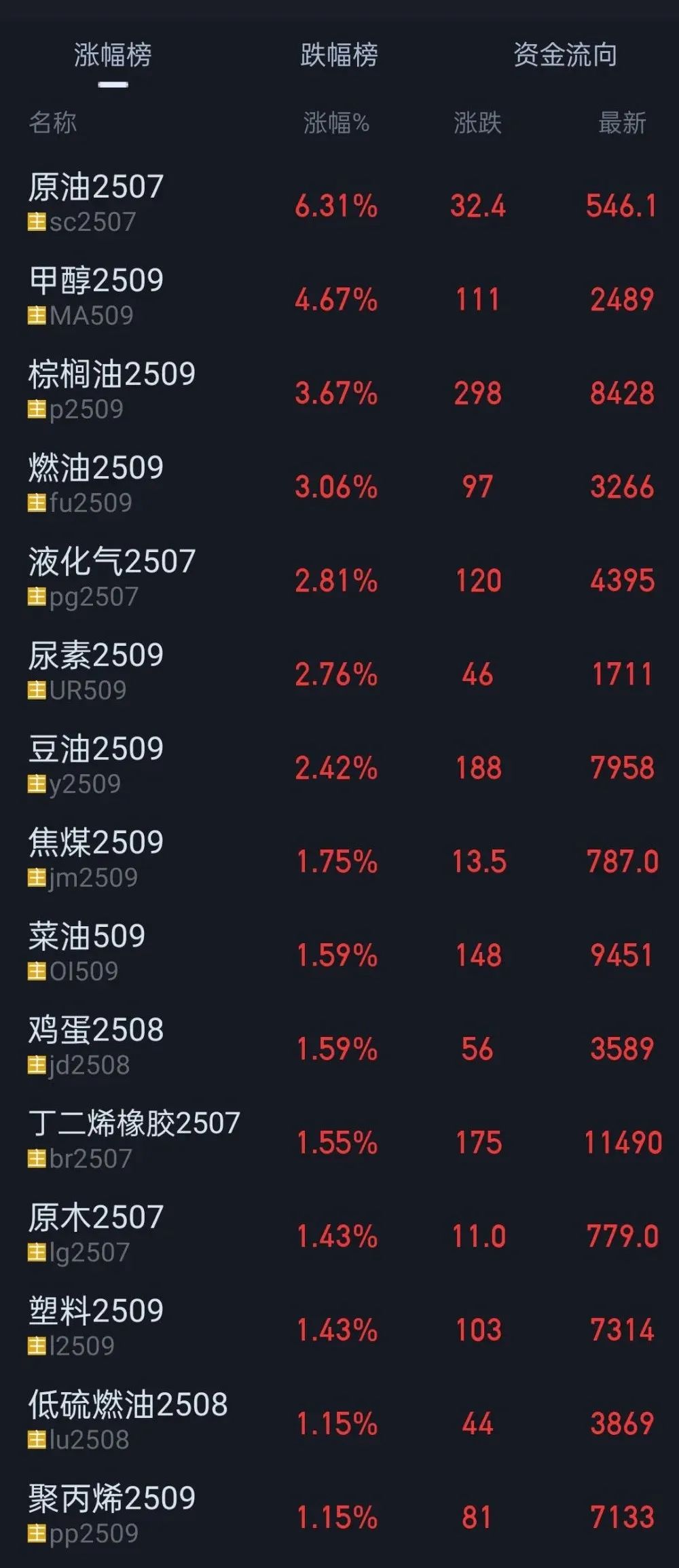 原油的火爆迅速傳導(dǎo)至化工期貨,盤面呈現(xiàn)一片“紅彤彤”景象,甲醇、尿素、丁二烯橡膠三大“猛將”帶頭沖鋒。其中甲醇2509上漲4.67%,尿素2509上漲2.76%,丁二烯橡膠2507上漲1.55%,聚丙烯2509上漲1.15%,乙二醇2509上漲1.08%,多晶硅2507上漲1.13%。
