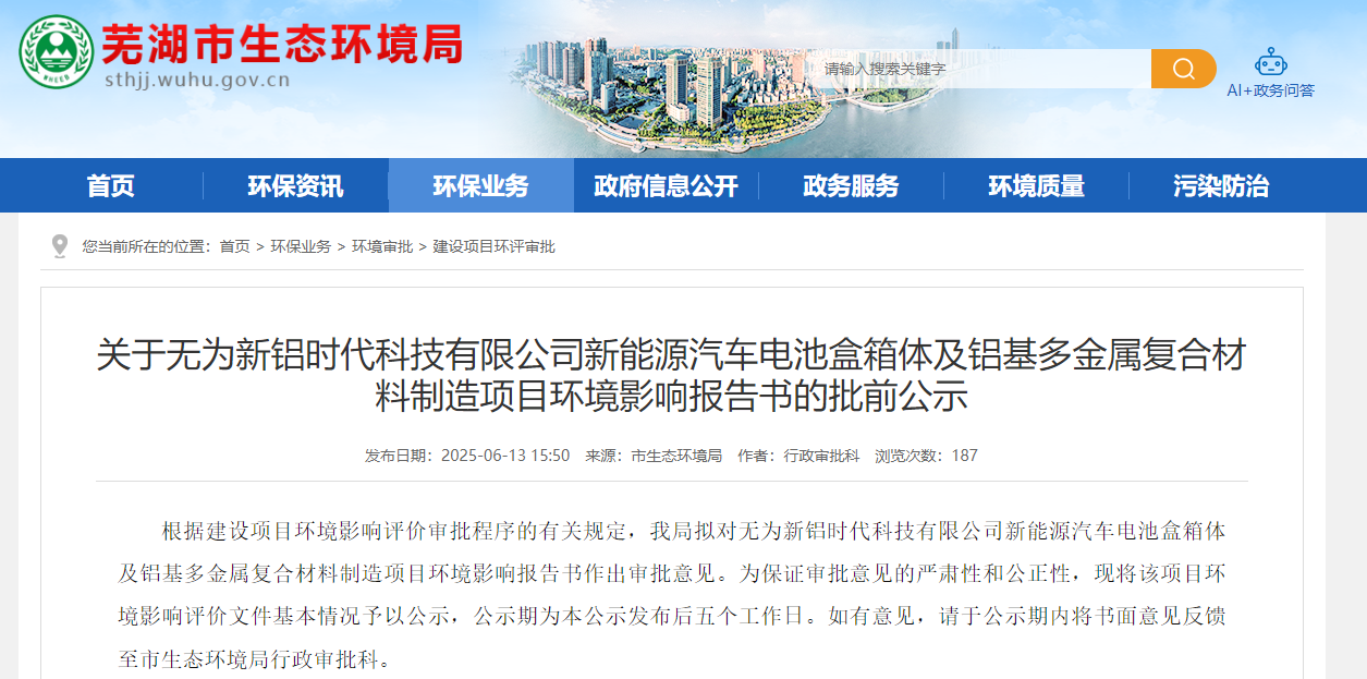 根據(jù)建設(shè)項(xiàng)目環(huán)境影響評(píng)價(jià)審批程序的有關(guān)規(guī)定,我局?jǐn)M對(duì)無為新鋁時(shí)代科技有限公司新能源汽車電池盒箱體及鋁基多金屬?gòu)?fù)合材料制造項(xiàng)目環(huán)境影響報(bào)告書作出審批意見。為保證審批意見的嚴(yán)肅性和公正性,現(xiàn)將該項(xiàng)目環(huán)境影響評(píng)價(jià)文件基本情況予以公示,公示期為本公示發(fā)布后五個(gè)工作日。如有意見,請(qǐng)于公示期內(nèi)將書面意見反饋至市生態(tài)環(huán)境局行政審批科。