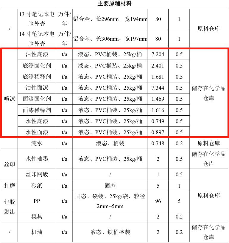 本項(xiàng)目主要從事筆記本電腦外殼噴涂的生產(chǎn)活動(dòng)。建設(shè)項(xiàng)目投產(chǎn)后,可年產(chǎn)金屬筆記本電腦外殼水性漆噴涂16萬件、金屬筆記本電腦外殼油性漆噴涂144萬件、塑料筆記本電腦外殼40萬件。