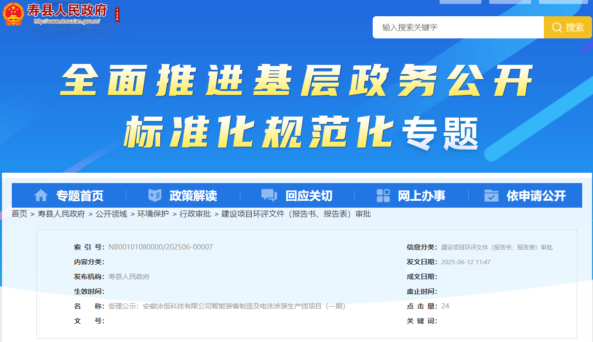 近日,壽縣人民政府發(fā)布安徽泳恒科技有限公司智能裝備制造及電泳涂裝生產(chǎn)線項(xiàng)目(一期)受理公示。