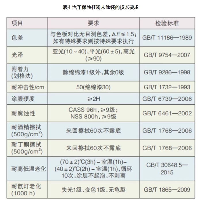 據(jù)報(bào)道阿克蘇諾貝爾生產(chǎn)的Interpon超耐候聚酯粉末色漆在佛羅里達(dá)曝曬60多個(gè)月后,保光率大于80%,并已為TOYOTA、HONDA、AUDI、PSA、FORD等汽車生產(chǎn)公司所采用,具有與傳統(tǒng)水性色漆涂料相類似的外觀,汽車車身粉末涂裝性能要求如表2所示。