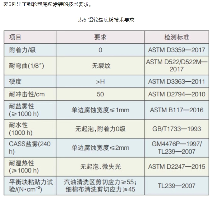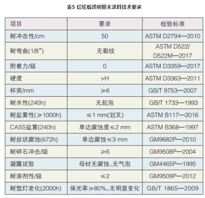 據(jù)報(bào)道,該鍍膜工藝現(xiàn)在已經(jīng)成功應(yīng)用,汽車鋁輪轂涂裝已經(jīng)逐漸轉(zhuǎn)向粉末全涂工藝發(fā)展。表5列出了鋁輪轂透明粉末涂料涂裝技術(shù)要求。