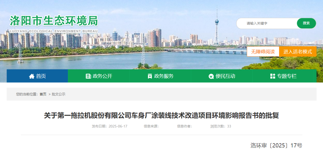 你單位(統(tǒng)一社會信用代碼:91410000170005381W)委托洛陽德方環(huán)??萍加邢薰揪幹频摹兜谝煌侠瓩C(jī)股份有限公司車身廠涂裝線技術(shù)改造項目環(huán)境影響報告書》(以下簡稱《報告書》)、專家技術(shù)評審意見、澗西分局初審意見、污染物排放總量替代意見收悉。該項目審批事項在我局網(wǎng)站公示期滿。根據(jù)《中華人民共和國環(huán)境保護(hù)法》《中華人民共和國行政許可法》《中華人民共和國環(huán)境影響評價法》《建設(shè)項目環(huán)境保護(hù)管理條例》等法律法規(guī)規(guī)定,經(jīng)研究,批復(fù)如下: