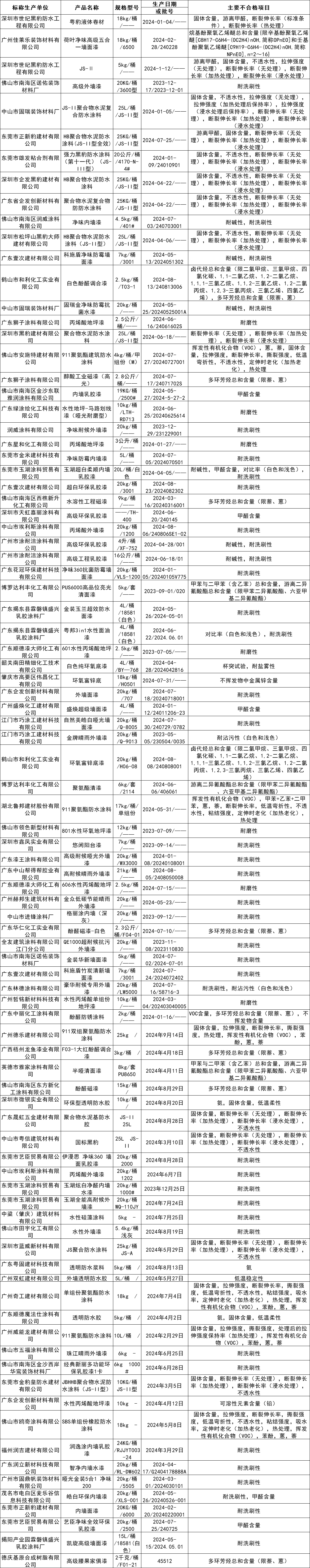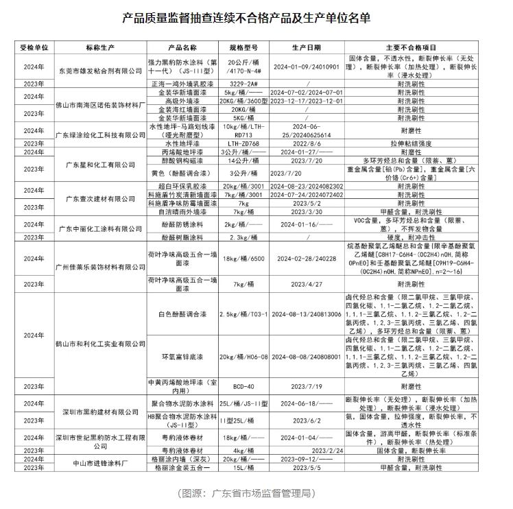 經比對近兩年監(jiān)督抽查結果,有25家生產單位連續(xù)兩年被抽查發(fā)現存在不合格產品的情況,在涂料領域,中山市進鋒涂料廠、深圳市黑豹建材有限公司、東莞市雄發(fā)粘合劑有限公司、佛山市南海區(qū)諾佑裝飾材料廠、深圳市世紀黑豹防水工程有限公司等連續(xù)兩年抽檢不合格。