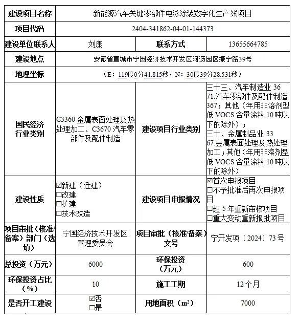 近日,宣城市寧國市生態(tài)環(huán)境分局發(fā)布新能源汽車關鍵零部件電泳涂裝數字化生產線項目環(huán)境影響報告表受理公示。