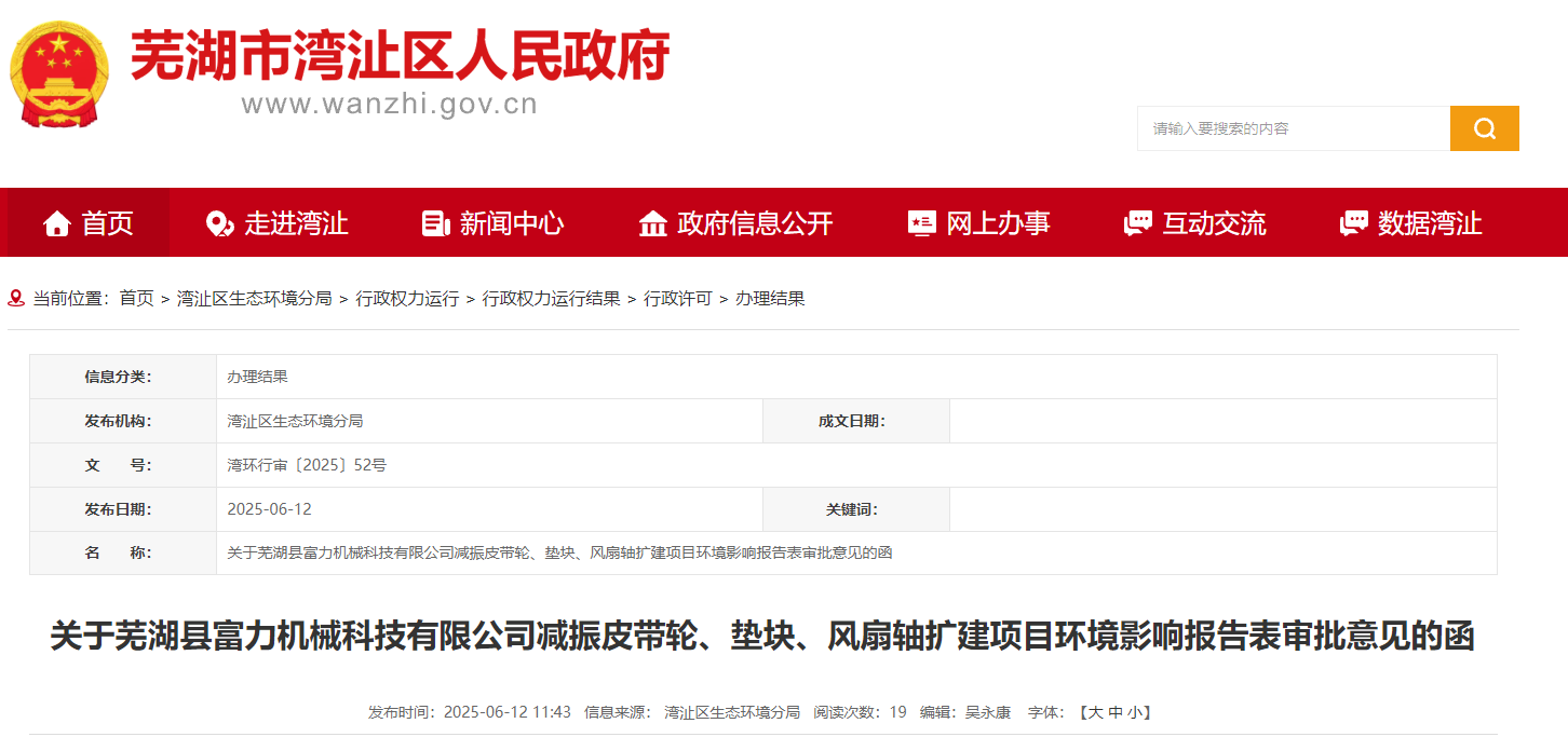 近日,灣沚區(qū)生態(tài)環(huán)境分局發(fā)布關(guān)于蕪湖縣富力機(jī)械科技有限公司減振皮帶輪、墊塊、風(fēng)扇軸擴(kuò)建項(xiàng)目環(huán)境影響報(bào)告表審批意見(jiàn)的函。