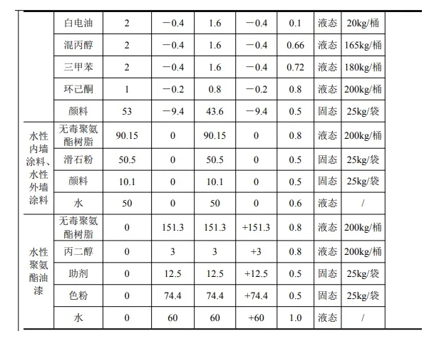 具體而言,該項(xiàng)目將減少丙烯酸漆產(chǎn)量15t/a、丙烯酸稀釋劑產(chǎn)量30t/a,同時(shí)新增水性聚氨酯油漆300t/a。改擴(kuò)建完成后,項(xiàng)目預(yù)計(jì)年產(chǎn)丙烯酸漆70t/a、丙烯酸稀釋劑 130t/a、水性外墻涂料100t/a、水性內(nèi)墻涂料100t/a以及水性聚氨酯油漆300t/a。這一調(diào)整不僅有助于企業(yè)更好地滿足市場對環(huán)保型涂料的需求,還能進(jìn)一步優(yōu)化產(chǎn)品結(jié)構(gòu),提升市場競爭力。