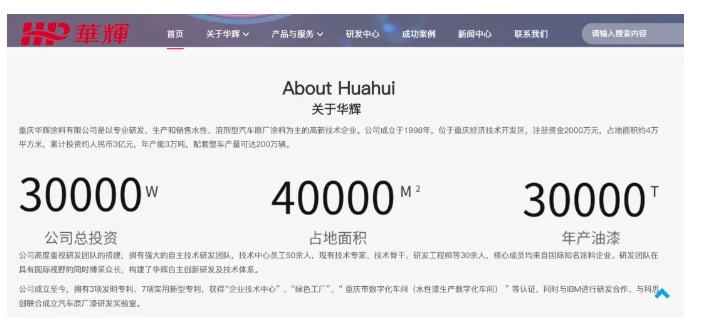 那么華輝涂料何許人也,為什么被比亞迪選中?據(jù)官網(wǎng)介紹,重慶華輝涂料成立于1998年,是一家集汽車涂料研發(fā)、生產(chǎn)、銷售及“涂裝一體化”服務(wù)的高新技術(shù)企業(yè),擁有省部級(jí)科技研發(fā)平臺(tái)“華輝涂料企業(yè)技術(shù)中心”,其服務(wù)網(wǎng)絡(luò)覆蓋東風(fēng)納米、奇瑞、長(zhǎng)安、長(zhǎng)城、SERES新能源汽車、易捷特新能源汽車、東風(fēng)小康汽車、中國(guó)一汽、上汽通用五菱汽車、華晨鑫源汽車、航天成功汽車、山東鴻日新能源汽車等主流車企,并榮獲重慶市“專精特新”企業(yè)、“綠色工廠”等多項(xiàng)榮譽(yù),技術(shù)實(shí)力與市場(chǎng)口碑兼具。