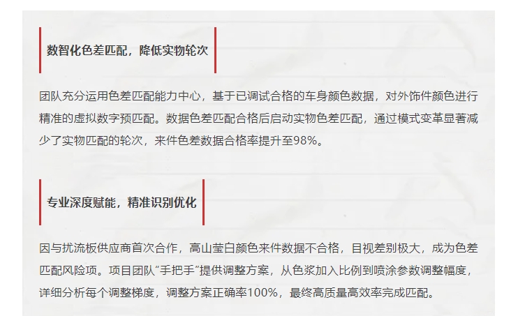 在紅旗品牌加速發(fā)展的關(guān)鍵時期,P301項目作為首個生準(zhǔn)周期壓縮至10個月以內(nèi)的標(biāo)桿性短周期項目,對各個環(huán)節(jié)提出了極致效率要求。作為涂裝生準(zhǔn)階段的核心環(huán)節(jié),色差匹配工作面臨前所未有的周期挑戰(zhàn)。P301項目團(tuán)隊打破常規(guī),創(chuàng)新采取數(shù)智化色差匹配、專業(yè)深度賦能、高效跨部門協(xié)同三大核心舉措,向傳統(tǒng)周期3個月發(fā)起挑戰(zhàn)。 (來源:一汽工程人涂裝工藝部)