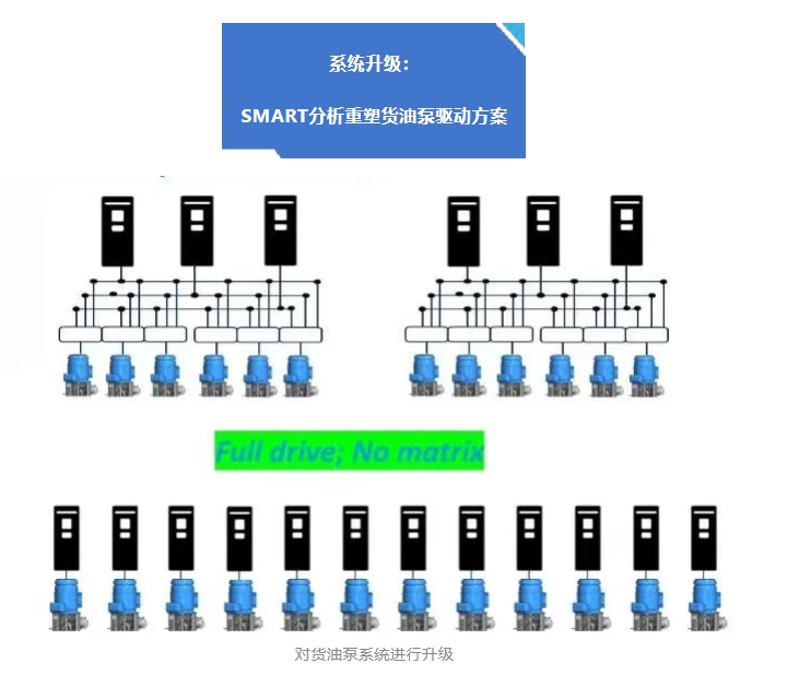 成品油/化學(xué)品油輪市場(chǎng)作為液貨船的一個(gè)分支,其貨油系統(tǒng)設(shè)計(jì)一般采用深井式貨油泵,即一艙一泵。深井式貨油泵在市場(chǎng)的主流配置是采用矩陣式電力驅(qū)動(dòng)方式,但這類驅(qū)動(dòng)方式在競(jìng)爭(zhēng)力、建造成本、客戶滿意度上都存在各自的不足。貨船所外裝室在SOCATRA MR油輪項(xiàng)目中主動(dòng)擔(dān)當(dāng),運(yùn)用SMART分析法設(shè)定清晰目標(biāo),與廠家一起對(duì)矩陣式驅(qū)動(dòng)進(jìn)行了改進(jìn)升級(jí),聯(lián)合貨船所電裝室聯(lián)合開展系統(tǒng)的風(fēng)險(xiǎn)分析,與供應(yīng)商一道與船東、船檢就技術(shù)方案開展討論,最終將矩陣式的電力驅(qū)動(dòng)方式改為全驅(qū)動(dòng)方案。新方案不僅滿足嚴(yán)苛要求,更成功推廣至后續(xù)船型,推動(dòng)了貨油泵驅(qū)動(dòng)技術(shù)的創(chuàng)新發(fā)展。