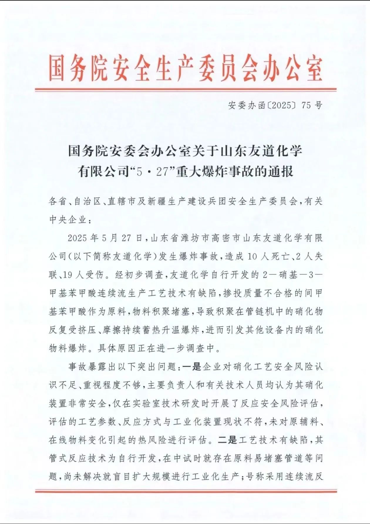 近日,國(guó)務(wù)院安委會(huì)辦公室發(fā)布關(guān)于山東友道化學(xué)有限公司“5?27”重大爆炸事故的通報(bào)。5月27日,該企業(yè)發(fā)生爆炸事故,造成10人死亡、2人失聯(lián)、19人受傷。初步調(diào)查顯示,事故因企業(yè)自行開發(fā)的生產(chǎn)工藝技術(shù)有缺陷,且使用不合格原料,導(dǎo)致物料積聚堵塞引發(fā)爆炸,具體原因仍在進(jìn)一步調(diào)查中。