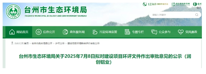臺州市生態(tài)環(huán)境局發(fā)布關(guān)于2025年7月8日擬對建設(shè)項目環(huán)評文件作出審批意見的公示(潤創(chuàng)鋁業(yè))。