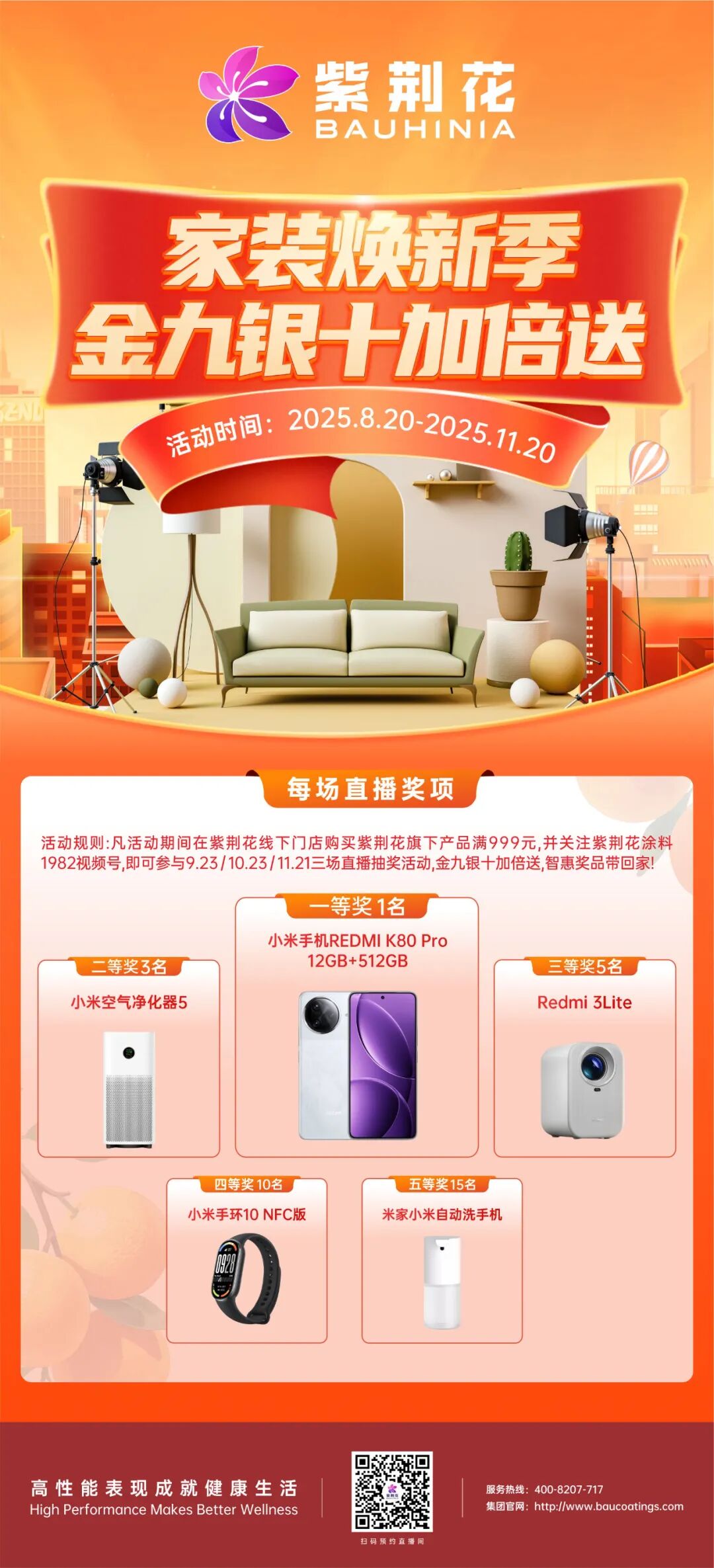 紫荊花“家裝煥新季,金九銀十加倍送”,每場(chǎng)直播抽獎(jiǎng)活動(dòng)的獎(jiǎng)項(xiàng)設(shè)置為:一等獎(jiǎng)1名 送小米手機(jī)REDMI K80 Pro 12GB+512GB,二等獎(jiǎng)3名 送小米空氣凈化器5.三等獎(jiǎng)5名 送小米投影儀Redmi 3Lite。加倍增設(shè)四等獎(jiǎng)10名 送小米手環(huán)10 NFC版,五等獎(jiǎng)15名 送米家小米自動(dòng)洗手機(jī)!