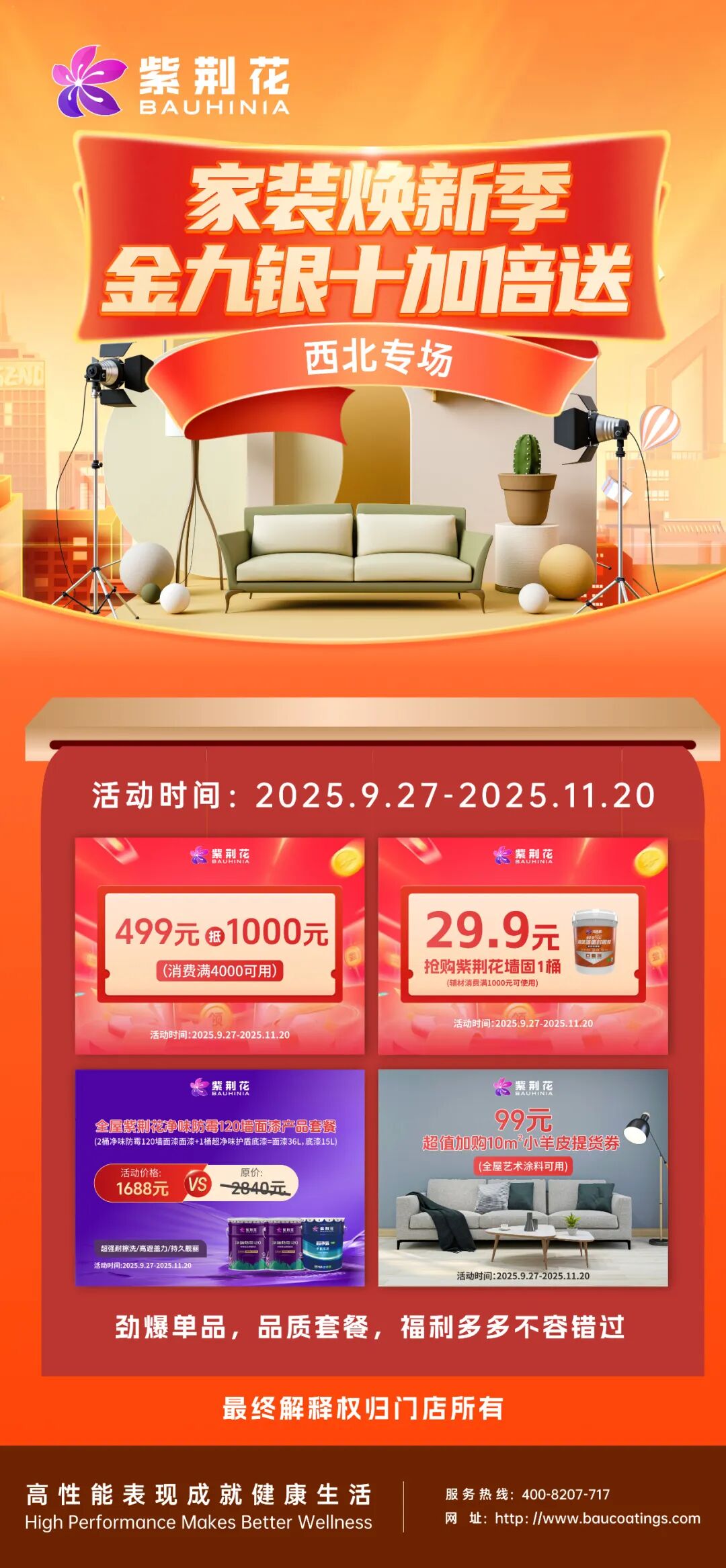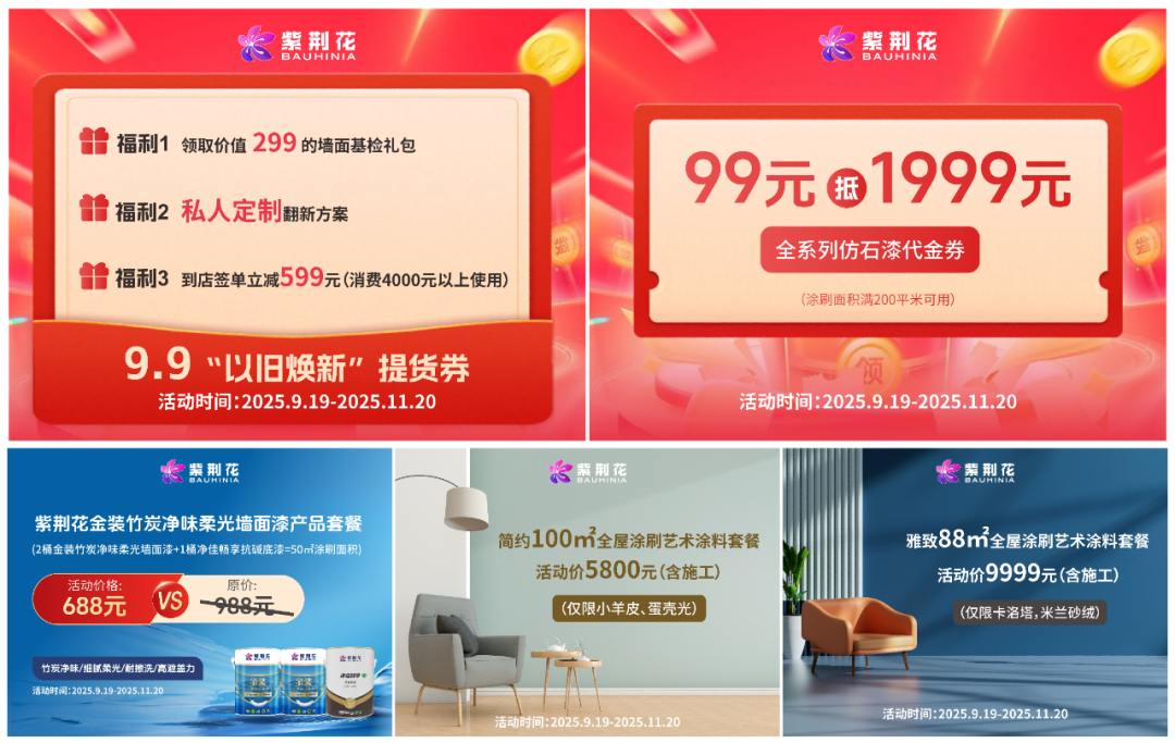 “家裝煥新季,金九銀十加倍送”活動(dòng)的規(guī)則:在2025.8.20-2025.11.20活動(dòng)期間,在紫荊花線下門店購(gòu)買紫荊花旗下任意產(chǎn)品或組合滿999.并關(guān)注紫荊花涂料1982視頻號(hào),即可參與9.23/10.23/11.21連續(xù)三場(chǎng)直播抽獎(jiǎng)活動(dòng),金九銀十加倍送,智惠獎(jiǎng)品帶回家!