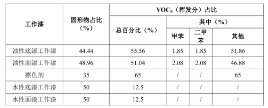 項(xiàng)目使用擦色劑可直接使用,無(wú)其他組分加入;油性底漆工作漆各組分比例為 PU底漆:PU固化劑 B-300:稀釋劑=1:0.5:1.2;油性面漆工作漆各組分比例為PU面漆:PU固化劑B-500:稀釋劑=1:0.5:0.9.工作漆中整個(gè)噴涂過(guò)程按工作漆中的有機(jī)溶劑(溶劑+稀釋劑)全部揮發(fā)計(jì)算。水性底漆工作漆各組分比例為水性底漆:水性固化劑=5:1;水性面漆工作漆各組分比例為水性面漆:水性固化劑 =5:1.根據(jù)各原漆物質(zhì)含量配比計(jì)算工作漆成分,如下表所示: