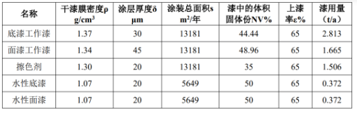 s—涂裝總面積(m2 /年),油性噴涂面積13181m2;水性噴涂面積為 5649m2;