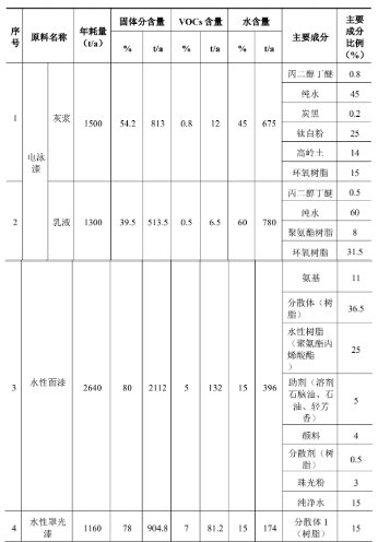 本項(xiàng)目含揮發(fā)性有機(jī)物的涂料有電泳漆、水性面漆、水性罩光漆、水性UV 面漆、水性 UV 罩光漆。