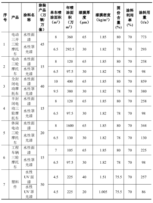 本項(xiàng)目擬生產(chǎn)6種摩托車產(chǎn)品,分別為電動(dòng)三開三輪摩托車、電動(dòng)車三輪摩托車、工程車輛三輪摩托車、全封閉電動(dòng)摩托車、半封閉電動(dòng)三輪摩托車、休閑電動(dòng)三輪摩托車,因此本項(xiàng)目針對(duì)6種產(chǎn)品計(jì)算噴涂涂料用量。根據(jù)企業(yè)提供的電動(dòng)車噴涂部件的尺寸,面漆噴涂一遍,罩光漆噴涂一遍。噴涂采用機(jī)器噴涂,噴涂利用率約70%,年噴漆電動(dòng)三輪摩托車150萬輛,年噴涂塑料件50萬件。