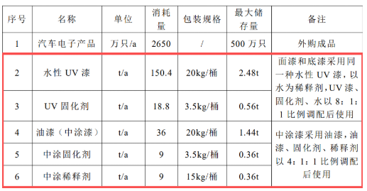 項(xiàng)目水性UV漆調(diào)配后含固率約49.29%,理論用漆量為187.972t/a,企業(yè)實(shí)際申報(bào)使用量共為188t/a(含稀釋劑水),油漆調(diào)配后含固率約61.65%,理論用 漆量為53.844t/a,企業(yè)實(shí)際申報(bào)使用量共為54t/a,實(shí)際生產(chǎn)過(guò)程中存在一定的 損耗,基本能與產(chǎn)能相匹配.