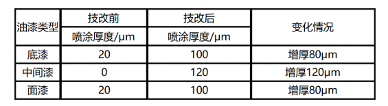 根據(jù)建設(shè)單位提供資料,廠區(qū)原有框架采用手動(dòng)噴涂,本次項(xiàng)目由于產(chǎn)品需要出口,故部分框架采用自動(dòng)噴涂;同時(shí)增加噴漆厚度,不改變噴漆面積,根據(jù)建設(shè)單位提供的資料,技改前后,框架的噴涂厚度變化情況如下表。