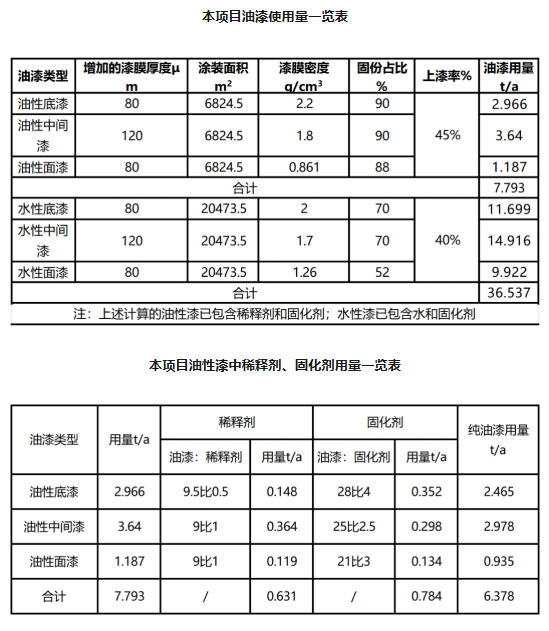 本次技改項(xiàng)目噴涂對(duì)象為運(yùn)輸機(jī)零部件(部分框架),其單套框架噴涂面積約為13.649m2;約有2000套需要噴漆(其中:約25%噴油性漆;約75%噴水性漆);則油性漆噴涂總面積為6824.5m2;水性漆噴涂總面積為20473.5m2.