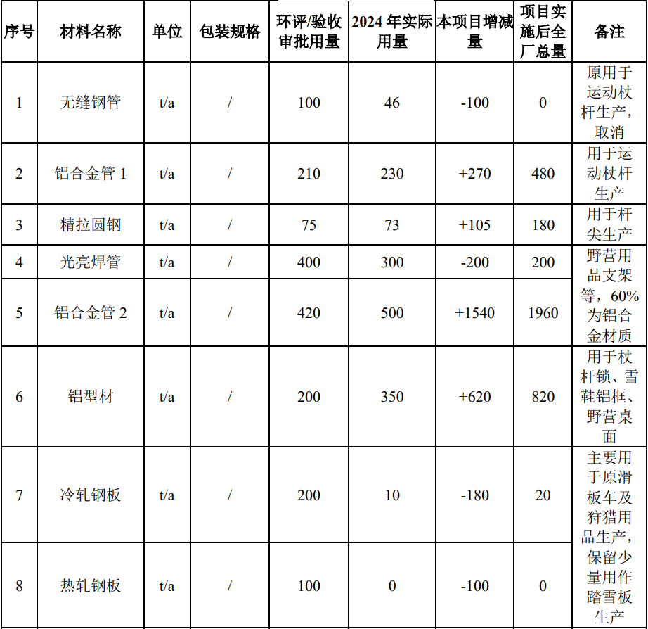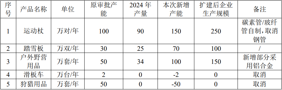(2)產(chǎn)能調(diào)整:增加運(yùn)動(dòng)杖、雪地行走鞋、戶外野營(yíng)用品生產(chǎn)產(chǎn)能,其中運(yùn)動(dòng) 杖由100萬(wàn)對(duì)/年擴(kuò)產(chǎn)到250萬(wàn)對(duì)/年、雪地行走鞋由30萬(wàn)雙/年擴(kuò)產(chǎn)到100萬(wàn)雙/年、 戶外野營(yíng)用品由50萬(wàn)套/年擴(kuò)產(chǎn)到150萬(wàn)套/年。