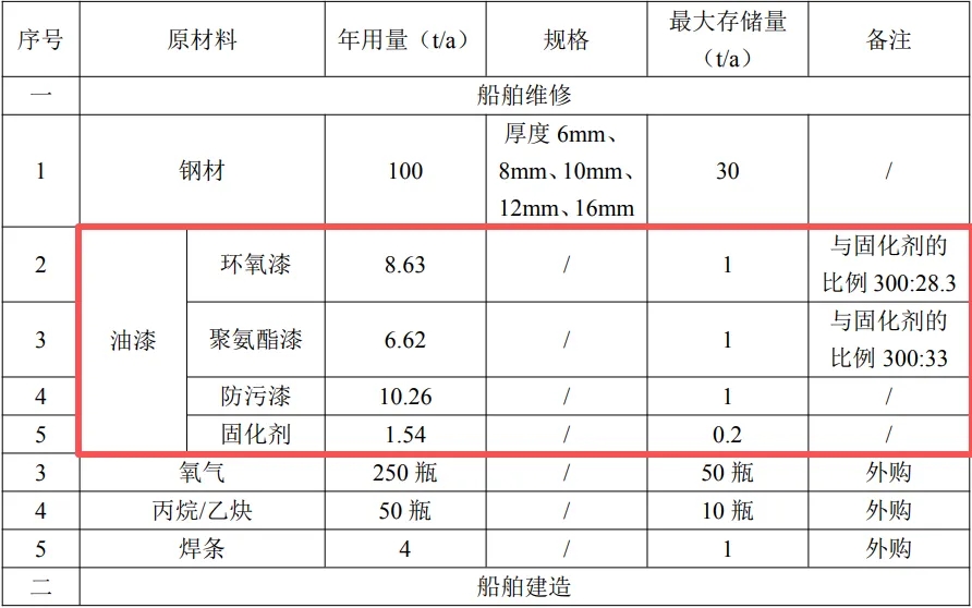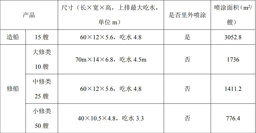 2、修船:本項目維修的船舶主要以海洋工程船舶、漁船、拖輪為主,由于每艘船舶維修需求不一致,一般僅需噴涂生銹部分(即吃水部分船身),本項目按照最大吹水面積進(jìn)行核算,則大修船舶每艘噴涂面積為70×14+14×4.5×2+70×4.5×2=1736m2.中修船舶每艘噴涂面積為60×12+60×4.8×2+12×4.8×2=1411.2m2.小修船舶每艘噴涂面積為40×10.5+14×3.3 ×2+40×3.3×2=776.4m2.