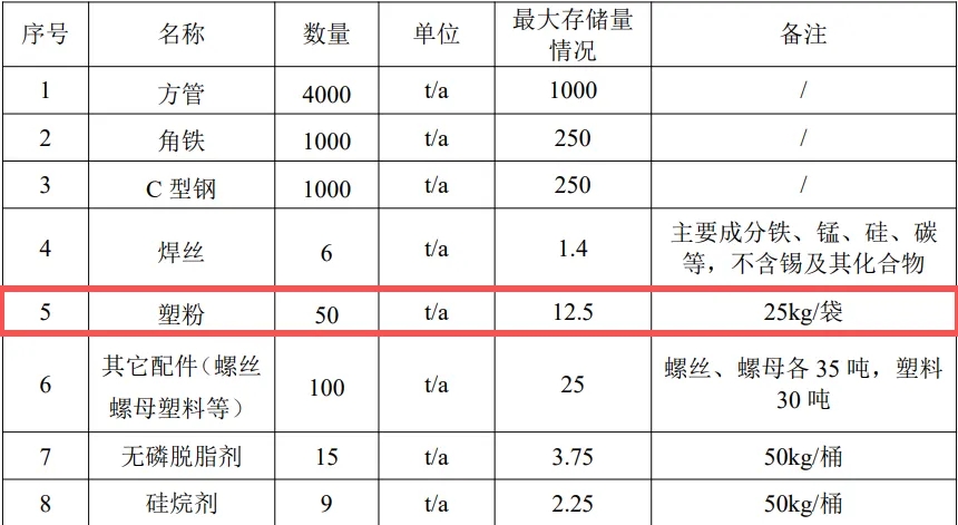 由上表可知,本項目理論上所需塑粉用量為46.171t/a,環(huán)評申報量為50t/a, 塑粉用量合理。