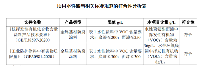 水性漆:根據涂料檢測報告可知,本項目水性聚氨酯面漆中揮發(fā)性有機物(VOCs)含量為36g/L,水性環(huán)氧底漆中揮發(fā)性有機物(VOCs)含量為 8g/L。與《低揮發(fā)性有機化合物含量涂料產品技術要求》(GB/T38597-2020) 及《工業(yè)防護涂料中有害物質限量》(GB30981-2020)等要求對比分析情況見下表。