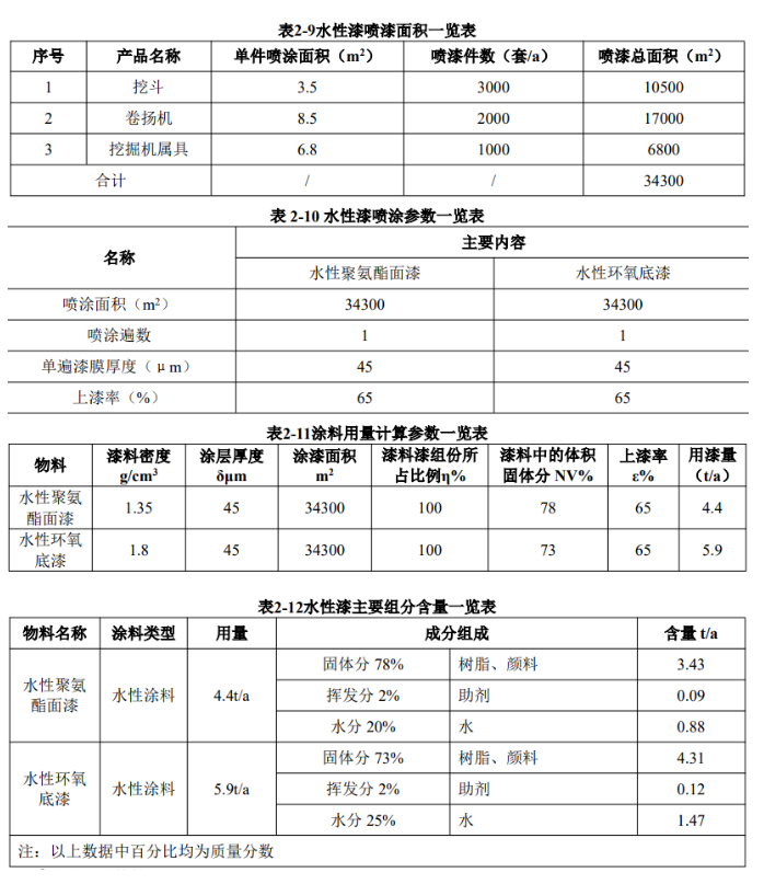 上漆率或附著率:指噴涂過程中附著在工件上的涂料占總用量的比例。根據項目噴涂工藝和供銷商提供的技術參數,同時查閱相關文獻資料(《談噴涂涂著效率》王錫春,《現代涂料與涂裝》2006.10),確定本項目水性漆上漆率≥65%。根據企業(yè)提供資料,項目噴漆工藝為面漆噴涂一遍,底漆噴涂一遍,共兩遍。