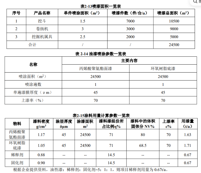 上漆率或附著率:指噴涂過程中附著在工件上的涂料占總用量的比例。根據項目噴涂工藝和供銷商提供 的技術參數,同時查閱相關文獻資料(《談噴涂涂著效率》王錫春,《現代涂料與涂裝》2006.10),確定本項目油漆上漆率≥70%。根據企業(yè)提供資料,項目噴漆工藝為面漆噴涂一遍,底漆噴涂一遍,共兩遍。
