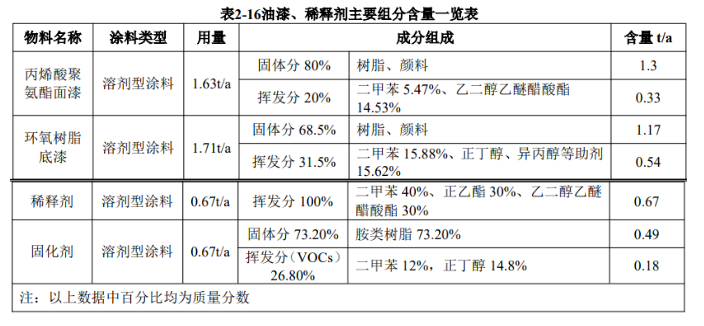 油性漆:根據涂料檢測報告可知,本項目丙烯酸聚氨酯面漆中揮發(fā)性有機物(VOCs)含量為315g/L,環(huán)氧樹脂 底漆中揮發(fā)性有機物(VOCs)含量為 331g/L,與《低揮發(fā)性有機化合物含量涂料產品技術要求》(GB/T38597-2020)及《工業(yè)防護涂料中有害物質限量》(GB30981-2020)等要求對比分析情況見下表。