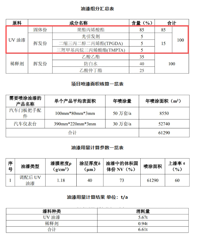 則配比好的油漆密度為(6+1)/(6/1..25+1/0.86)=1.18g/cm3.揮發(fā)份含量為(6*15%+1*100%)/(6+1)=27%,揮發(fā)份量為1.04*40%=318g/L,滿足《低揮發(fā)性有機(jī)化合物含量涂料產(chǎn)品技術(shù)要求》中表4輻射固化型金屬基材與塑料基材噴涂VOC含量的限量值要求(350g/L)以及《車輛涂料中有害物質(zhì)限量》(GB24409-2020)中輻射固化型涂料非水性噴涂VOC含量的限量值要求(≤550g/L)。