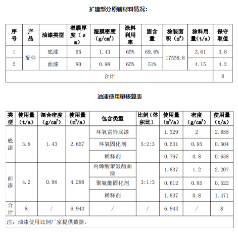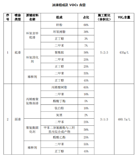 底漆VOCs含量計(jì)算:根據(jù)附件環(huán)氧富鋅底漆、環(huán)氧固化劑、稀釋劑的MSDS 報(bào)告,揮發(fā)份為正丁醇、二甲苯;揮發(fā)量為10%、環(huán)氧固化劑揮發(fā)量為50%、稀釋劑揮發(fā)量100%。施工配比的VOCs含量為(5×2×10%+2×0.95×50%+3×0.8×100%)÷10=435g/L。同理面漆 VOCs含量480.7g/L。