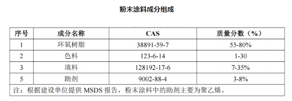 項目采用靜電噴涂方式將粉末涂料吸附于工件表面,再加熱固化轉化為耐久的涂膜。根據(jù)供應商提供原料成分,項目粉末涂料主要成分見下表: