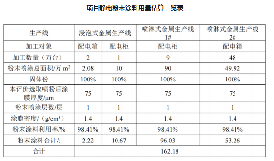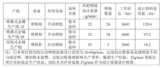 噴槍的粉末輸出量取決于所需的涂層厚度,本項目兩條線所使用的自動噴槍型號相同,數(shù)量不同,自動噴槍技術參數(shù)見附件10.為保證涂膜厚度一致,根據(jù)項目實際生產(chǎn)經(jīng)驗和自動噴槍技術參數(shù)綜合可知,噴淋式金屬生產(chǎn)線1#中每支噴槍設計噴粉量約為 25g/min;噴淋式金屬生產(chǎn)線 2#中每支噴槍設計噴粉量約為25g/min;浸泡式金屬生產(chǎn)線中每支噴槍設計噴粉量約為25g/min。