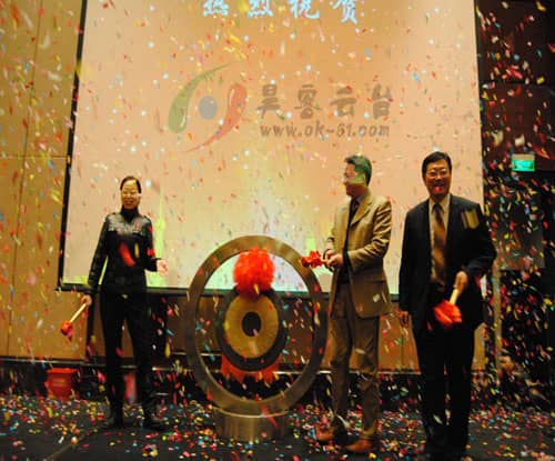 攀枝花市委常委艾磊(右一)、中涂協(xié)孫蓮英會(huì)長(zhǎng)(左一)與董事長(zhǎng)童曉宇(右二)為昊客云臺(tái)開(kāi)鑼